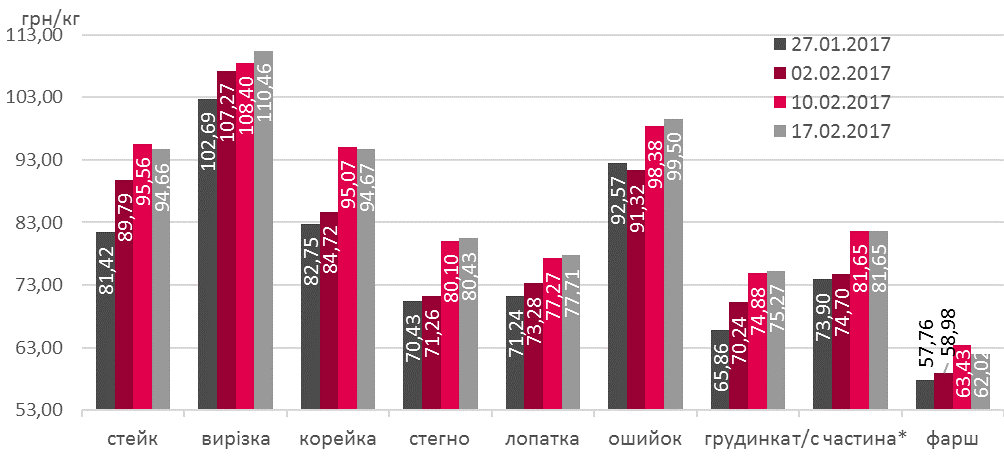 Изменение средних розничных цен на отдельные свиные части состоянию на 27.01-17.02.2017 г.
