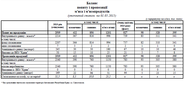 Баланс попиту і пропозиції м`яса і м`ясопродуктів (січень-травень 2015)