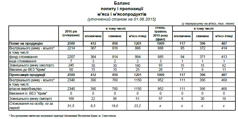 Баланс попиту і пропозиції м`яса і м`ясопродуктів (січень-червень 2015)