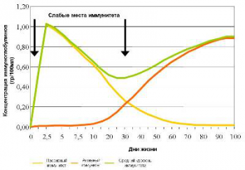 Если развитие иммунитета поросёнка представить в виде графика, то будут отчётливо видны два иммунных люка – периоды времени, в которые организм поросёнка не защищён от возбудителей болезней. Один из таких люков – сразу поле рождения. Второй – между четвёртой и шестой неделей, так как в этот период пассивный иммунитет снижается, а свой собственный активный ещё не