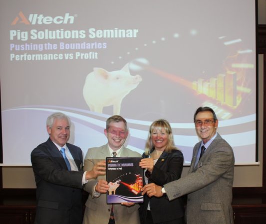 На фото: Зліва направо: професор Майкл Мерта, Університет Міннесоти, США, професор Ханс Стейн, Університет Іллінойсу, США, доктор Джулз Тейлок-Пікард, Оллтек і д-р Лучано Роппа, Provimi, Бразилія на Семінарі Оллтек «Рішення для свинарства»: «Розширюючи горизонти – Продуктивність vs. Прибуток», який відбувся в Данбойн, Ірландія у вівторок, 11 жовтня 2011 року.