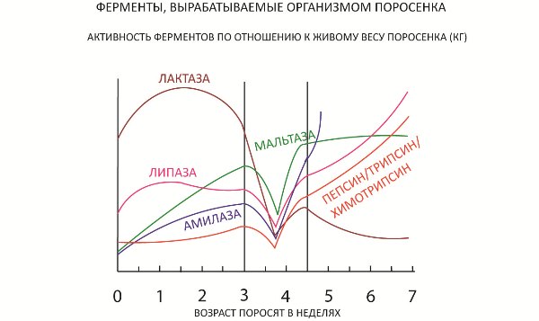 Амилаза — фермент, который способствует усвоению крахмала. В момент рождения поросенка его имеется небольшое количество. По мере роста поросенка фермент амилаза приобретает главенствующее значение. К моменту отъема количество амилазы в желудке недостаточное, чтобы хорошо переваривать твердый рацион. Отсюда следует, что при отъеме поросенка в раннем возрасте не следует переводить его сразу на корм, содержащий высокий уровень крахмала, особенно тяжело усвояемого.