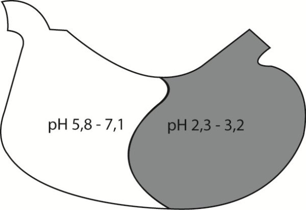 В связи с недостаточной выработкой желудочных соков и собственных энзимов происходит недостаточное переваривание кормов и, зачастую, образование фракций кормов в ЖКТ. Одна фракция пропитывается желудочными соками и имеет нормальный уровень (<рН3), в которой проходит нормальный процесс пищеварения; другая фракция, непропитанная желудочными соками, с уровнем (рН5<), которая плохо усваивается.