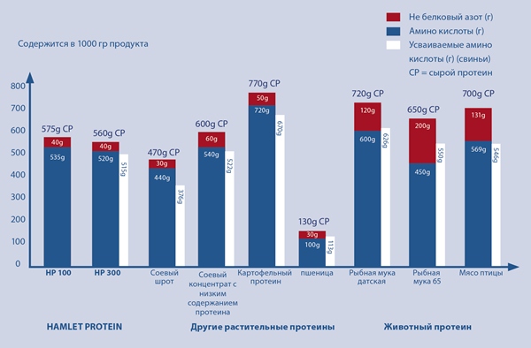 Графік, наведений нижче, показує порівняльний вміст білка в продукті HP 300 з іншими джерелами протеїну. Не дивлячись на те, що HP 300 містить всього 56% білка (що менше в порівнянні, наприклад з 72 % білка у данському рибному борошні), класифікація азоту показує нам що: