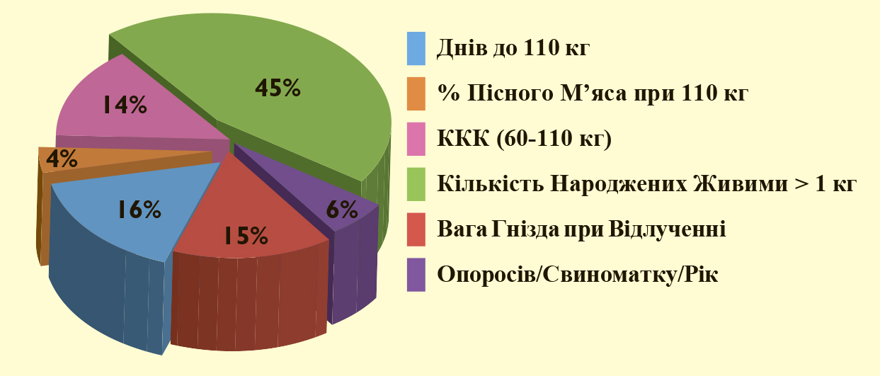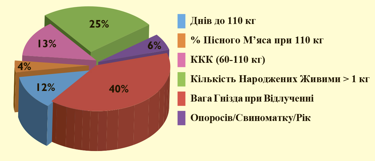 Усвідомлюючи важливість вищевикладеного результату, компанія Hermіtage розробила Індекс Материнської Лінії з особливим акцентом на вазі гнізда при відлученні — діаграма 2. Цей показник — засіб відбору, з огляду на високий вихід молока (спадковий показник). Так, починаючи з січня 2014 року племінні підприємства компанії Hermіtage зважили 1700 гнізд порід Ландрас та Велика Біла при відлученні. Це дало змогу відібрати кнурів Материнської лінії для штучного запліднення з високою племінною цінністю, зокрема і молочністю. Деякі ферми в якості першочергового пріоритету переважно орієнтуються на поліпшення розміру гнізда — діаграма 1. Разом з тим, інші господарства зацікавлені у збільшенні ваги гнізда при відлученні (задоволені кількістю народжених живими).