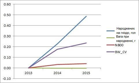 Графік № 2. Залежність ваги при народженні від кількості народжених поросят у гнізді — при комбінованій селекції на збільшення кількості народжених поросят та збереженні або можливому збільшенні ваги поросят при народженні