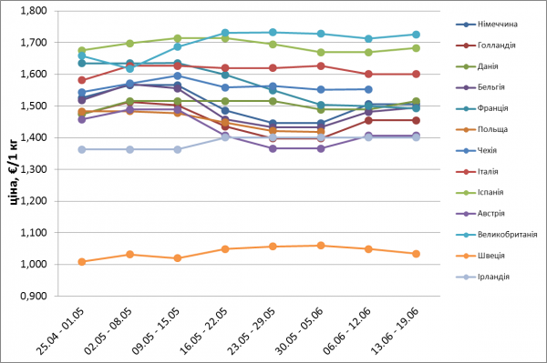 За винятком деяких країн, котирування за базовою умовою на більшості ринків ЄС зараз рухається у боковому ціновому коридорі. В основному в Європі панує позитивний настрій, хоча через вихідний день на бійнях після Трійці ціни навряд чи встигнуть піднятися вище до кінця тижня. Котирування за базовою умовою в Німеччині так і продовжує диктувати тенденцію для ринку. Але не зважаючи це, значно піднялись ціни в Данії, яка іде попереду Німеччини та Франції в європейській ціновій структурі. В Іспанії ціни знову пішли вниз. У Франції котирування за корегованою умовою знизилось на критичні €0,7.