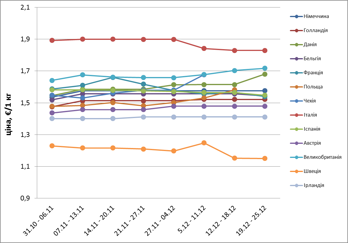 Тенденції для ринку Німеччини: виробники у Німеччині сподівались, що той ціновий рівень, якого досягли в поточному році, збережеться і в наступному. У той же час, при встановленні цін вони були помірними, і не перебільшували. Але забійні компанії цим користуються і намагаються встановити свої власні ціни. Цього року і Різдво і Новий рік припадають на суботу та неділю. Отже забійні компанії будуть вихідними лише один день. До цього часу широка пропозиція свиней забійних кондицій швидко знаходила ринок збуту. Залишається сподіватись, що встановлені забійними компаніями власні ціни будуть гарним уроком для виробників, з якого вони зроблять належний висновок, і якомога більше партій продадуть іншим бійням.