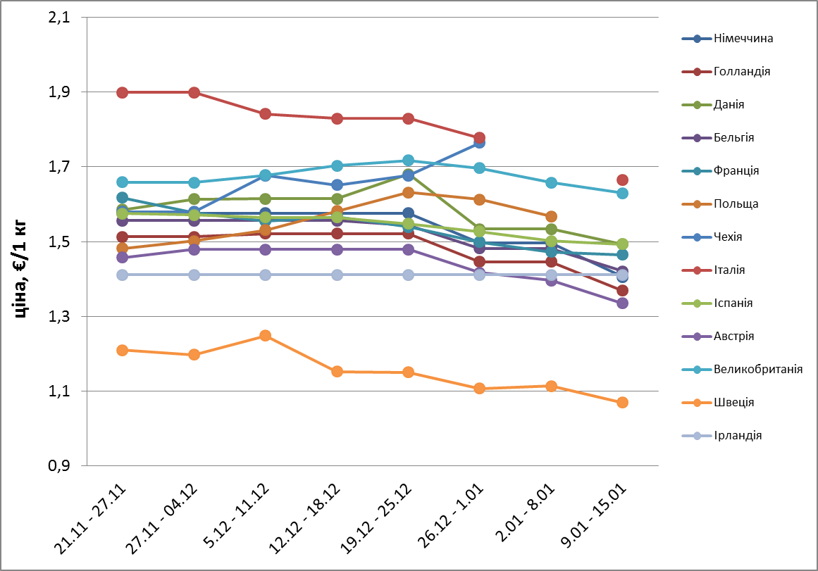 Найбільшого зниження в ціні зазнали Німеччина (на 9 центів) та Нідерланди (на 8 центів). У четвер минулого тижня, навіть до того, як асоціація виробників свинини оголосила ціну, компанія VION встановила ціну, нижчу на 10 центів.