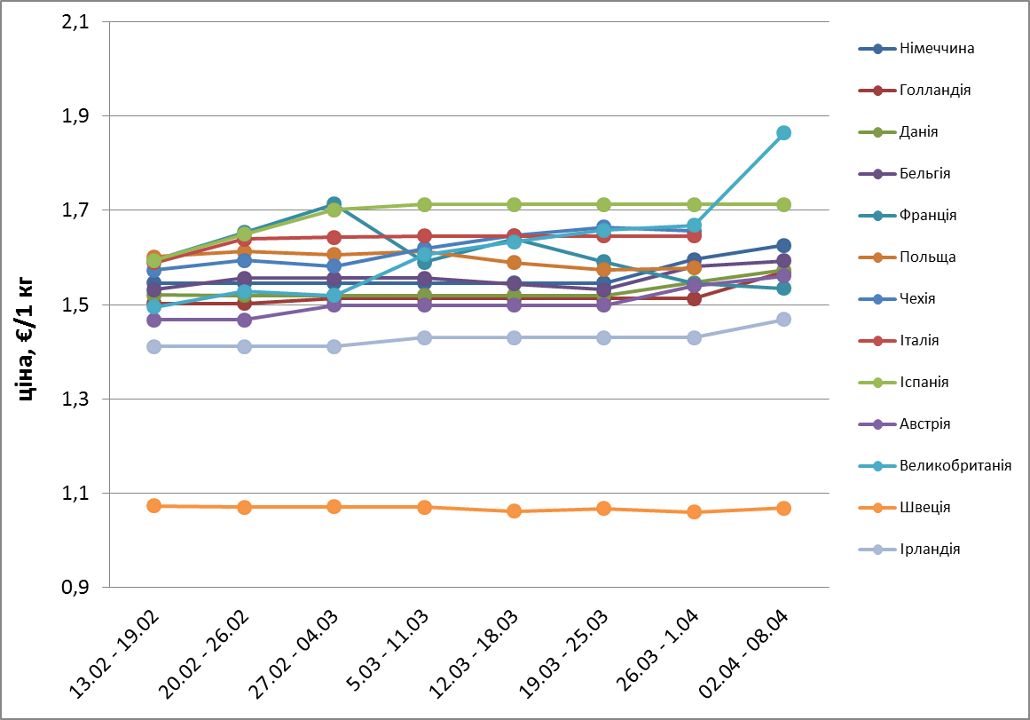 В Данії ціна також зросла на 3 центи. В Нідерландах та Австрії ціна зросла на 2 центи, а в Бельгії - на 1 цент. Не змінилась ціна в Іспанії. У цій країні ситуація на ринку свиней забійних кондицій збалансована. Французи впевненні, що зниження ціни на 1 цент, призвело до того, що ціна у Франції досягла найнижчої позначки.