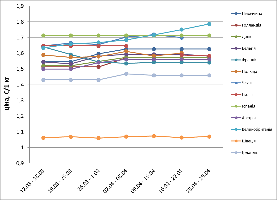 Тенденції для ринку Німеччини: настрій на ринку свиней забійних кондицій Німеччини - яскравий. Як очікують, напередодні 1 травня попит на м'ясо для пікніків пожвавиться. Прогноз погоди також сприятливий. Отож, ціни на свиней залишаться, щонайменше, стабільними.