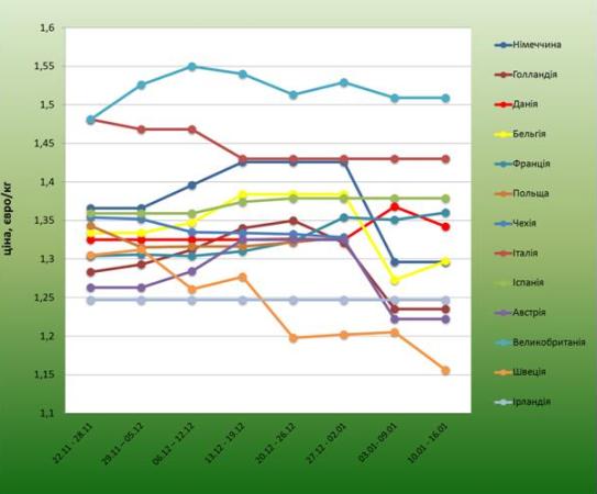 Котирування незначно коливається навколо нещодавно досягнутого рівня. Датські котирування, що протягом останніх тижнів були досить стабільними, відчутно понизились — на 2,6 євроцента. У Франції ціни пішли вгору, відповідно займаючи друге місце серед п’ятірки європейських країн, в яких утримується найбільше свиней. Німеччина займає передостаннє місце у п’ятірці – перед Голландією.