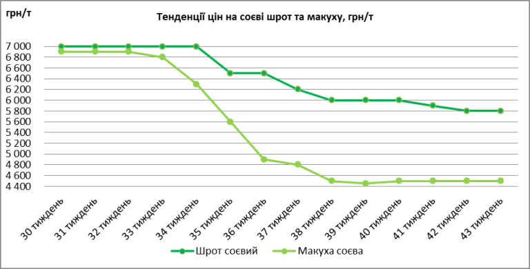 Ціни на соєві шріт та макуху продовжують залишатися стабільними за рахунок ціни на сировину нового урожаю. Відпускні ціни соєвого шроту минулого тижня були на рівні 5300-5800 грн/т. на умовах EXW. Вартість соєвої макухи минулого тижня варіювалася в діапазоні від 4200 грн/т до 4500 грн/т на умовах EXW, залежно від якісних показників.