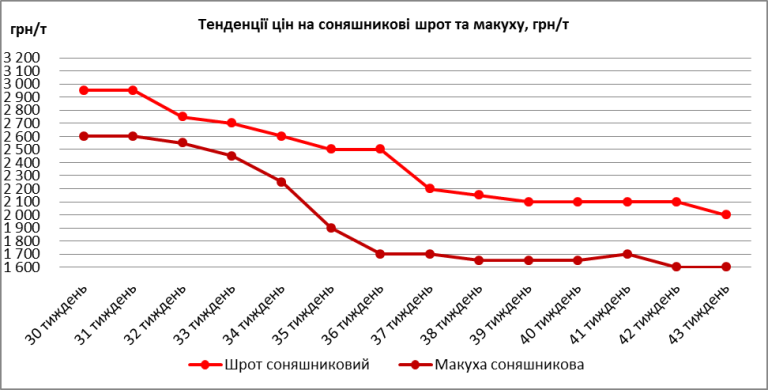 Ціни на соняшникову макуху за тиждень також знизилися, але найчастіше переглядали мінімальні відпускні ціни. Діапазон цін макухи соняшника складав 1450–1800 грн/т залежно від якісних показників. Варто зазначити, що в даному сегменті відзначається сезонне збільшення попиту на продукт.