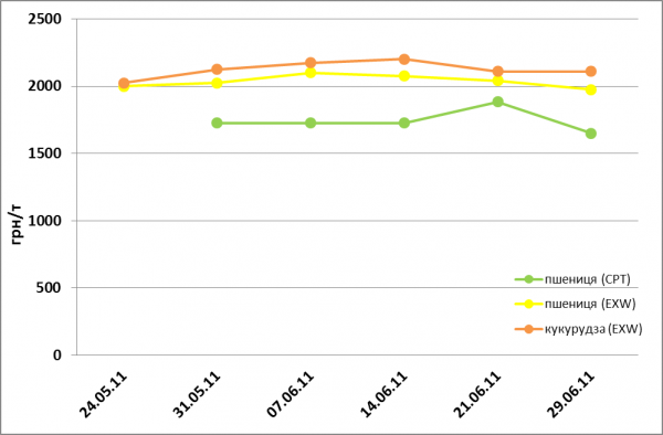 За період з 21 по 29 червня особливо помічаються коливання пшеничних котирувань. Так, пшениця (на умовах СРТ) подешевшала більше ніж на 12% (223 грн/т) до відмітки 1650 грн/т. Слід зауважити, що така ціна є найнижчою у поточному році. Щодо пшениці (на умовах EXW), то ціна на неї знизилась на 3,2% (65 грн/т) до 1975 грн/т. Тільки ціни на кукурудзу (на умовах EXW) залишилась без змін — 2110 грн/т.