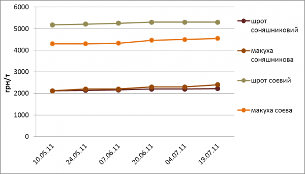 З 1 червня по 1 липня поточного року ціна на шрот соняшниковий зросла на 1% (20 грн/т) та становила 2200 грн/т. Соняшникова макуха додала у ціні 4,4% (100 грн/т) та коштувала 2350 грн/т. Щодо соєвого шроту та соєвої макухи, то вони подорожчали на 0,5% (25 грн/т) та 3% (130 грн/т) відповідно до 5300 грн/т та 4525 грн/т.