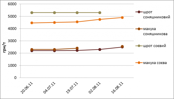 У серпні поточного року, у порівнянні з попереднім місяцем ціни на шрот соняшниковий зросли на 9,1% (200 грн/т) до 2400 грн/т, а макуха із соняшнику додала у ціні 8,5% (200 грн/т) і коштувала 2250 грн/т. Щодо соєвого шроту, то він подорожчав майже на 2% (100 грн/т) до 5400 грн/т. Ціна соєвої макухи підвищилась на 6,6% (300 грн/т) до 4825 грн/т.