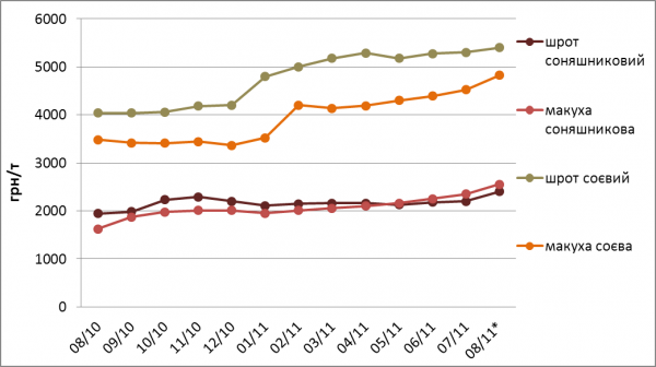 У серпні поточного року, у порівнянні з попереднім місяцем ціни на шрот соняшниковий зросли на 9,1% (200 грн/т) до 2400 грн/т, а макуха із соняшнику додала у ціні 8,5% (200 грн/т) і коштувала 2250 грн/т. Щодо соєвого шроту, то він подорожчав майже на 2% (100 грн/т) до 5400 грн/т. Ціна соєвої макухи підвищилась на 6,6% (300 грн/т) до 4825 грн/т.
