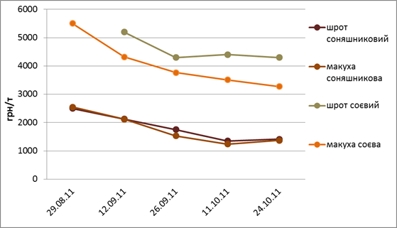 Уже третій місяць поспіль триває зниження цін на концентровані корми, вироблені із сої та соняшнику. Особливо стрімке падіння цін відмічається на шрот соняшниковий і макуху соєву та соняшникову. Рівень жовтневих цін поточного року вже опустився нижче рівня попереднього року. Ціна на соєвий шрот знижується не такими швидкими темпами.
