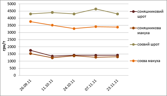 Після доволі тривалого періоду зниження цін, що розпочався ще у серпні поточного року, на ринку концентрованих кормів встановилась відносна рівновага і протягом листопада місяця вартість даної категорії товарів майже не змінювалась. Але невідомо, як довго триватиме такий період стабільності цін, оскільки формування ціни на концентровані корми напряму залежить від вартості сої та соняшнику. Оскільки Україна є експортно орієнтованою країною по олійним культурам, формування ціни в більшій мірі залежить від цін, що встановлюються на світових ринках. На даний момент важко прогнозувати, якою ж буде ціна на соняшник та сою, оскільки на світових ринках спостерігається нестабільна ситуація. Гравці ринку очікують, як буде розвиватись ситуація з кризою євро, китайським імпортом, курсом долара США, цінами на нафту та розвитком економіки у світі.