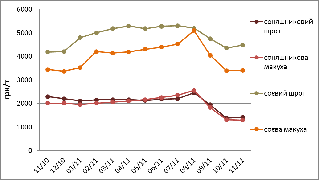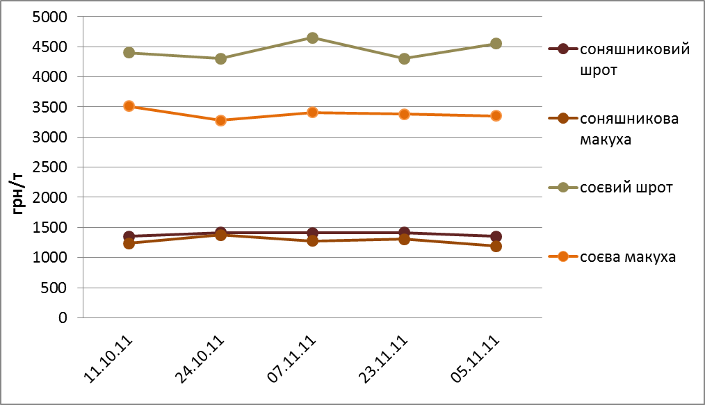 Після доволі тривалого періоду зниження цін, що розпочався ще у серпні поточного року, на ринку концентрованих кормів встановилась відносна рівновага і протягом листопада місяця вартість даної категорії товарів майже не змінювалась. Але невідомо, як довго триватиме такий період стабільності цін, оскільки формування ціни на концентровані корми напряму залежить від вартості сої та соняшнику. Оскільки Україна є експортно орієнтованою країною по олійним культурам, формування ціни в більшій мірі залежить від цін, що встановлюються на світових ринках. На даний момент важко прогнозувати, якою ж буде ціна на соняшник та сою, оскільки на світових ринках спостерігається нестабільна ситуація. Гравці ринку очікують, як буде розвиватись ситуація з кризою євро, китайським імпортом, курсом долара США, цінами на нафту та розвитком економіки у світі.