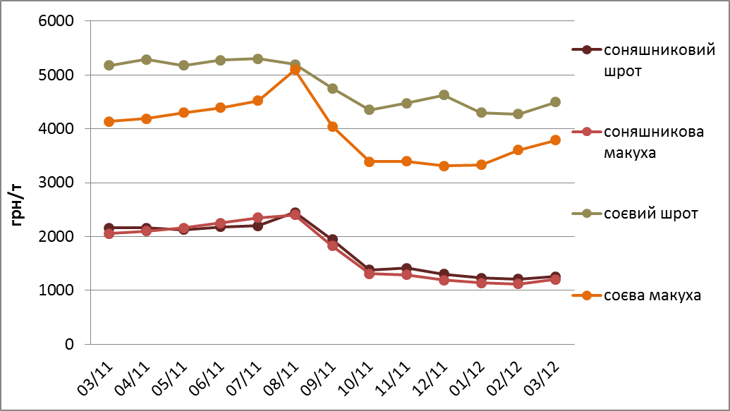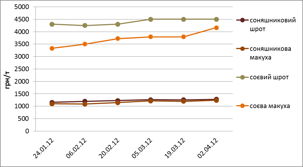 Рис. 1. Динаміка цін на концентровані корми, березень – березень 2011-2012 р.р. (за даними олійно-екстракційних заводів)
