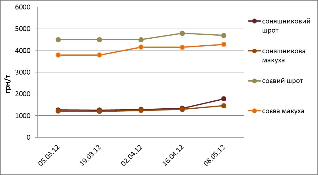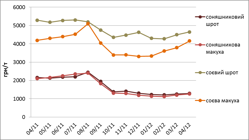Рис. 1. Динаміка цін на концентровані корми, квітень – квітень 2011-2012 р.р. (за даними олійно-екстракційних заводів)