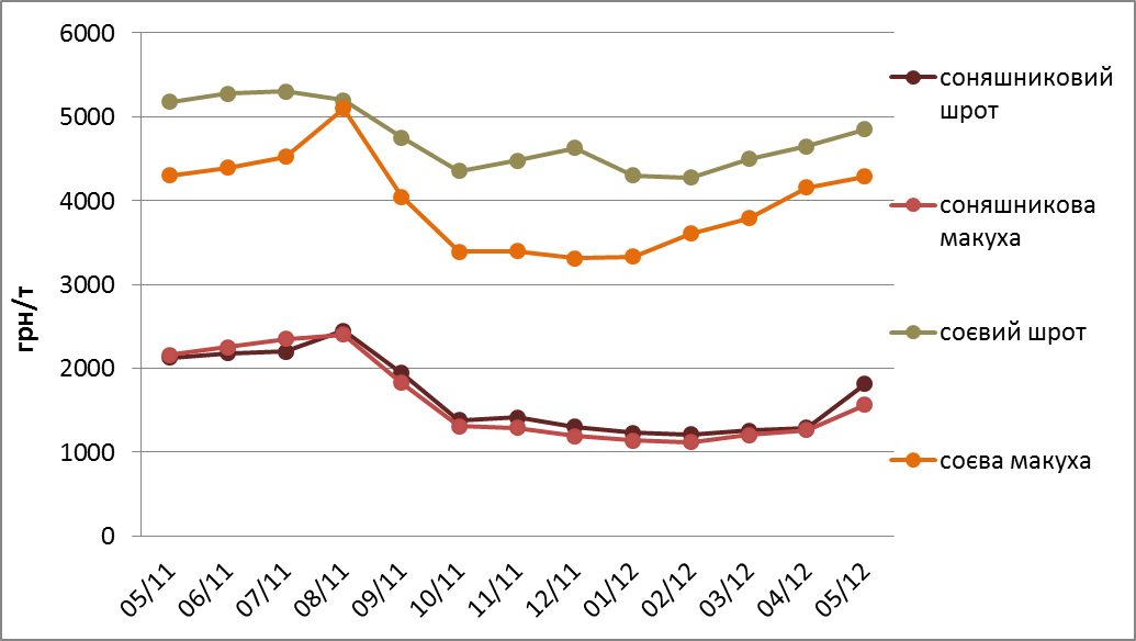 В Україні триває сезонне зростання цін на концентровані корми. Таке подорожчання пов’язане зі стабільним ростом закупівельних цін на сою у світі (внаслідок чого зросла ціна і в Україні). У травні, порівняно із квітнем поточного року середньомісячна ціна на соняшниковий шрот зросла ще на 40% до рівня 1815 грн/т, а соняшникова макуха подорожчала на 24% до 1565 грн/т. Стосовно соєвого шроту, то ціна на нього підвищилась на 4% до 4850, а соєва макуха, додавши до попередньої ціни ще 3,3%, коштувала 4290 грн/т.