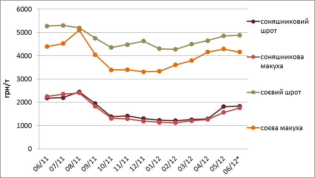 У першій половині червня на українському ринку концентрованих кормів спостерігалась неоднозначна ситуація: ціни рухались у різних напрямках. Зокрема, ціна на соняшниковий шрот підвищилась менш, ніж на 1% до рівня 1830 грн/т, а шрот соєвий додав у ціні 0,7%, після чого його вартість становила 4886 грн/т. Найбільшого зростання зазнала ціна на соняшникову макуху. Порівняно із травневою ціною, ціна на цей концентрований корм підвищилась на 12,2% та досягла рівня 1760 грн/т. Помітних змін зазнала ціна на соєву макуху. Знизившись на 3%, вона коштувала 4155 грн/т.