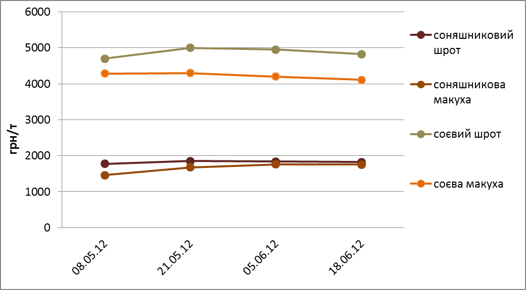 Якщо ж спостерігати за цінами з 5 по 18 червня, то тут спостерігалось зниження за всіма товарними позиціями. Зокрема, ціна на соняшниковий шрот знизилась на 1% до 1820 грн/т, а соняшникова макуха подешевшала на 0,3% (до 1755 грн/т). Стосовно соняшникового шроту, то ціна на нього знизилась на 3,6% (до 4825 грн/т), а соєва макуха, втративши 2% від попередньої ціни, коштувала 4110 грн/т.