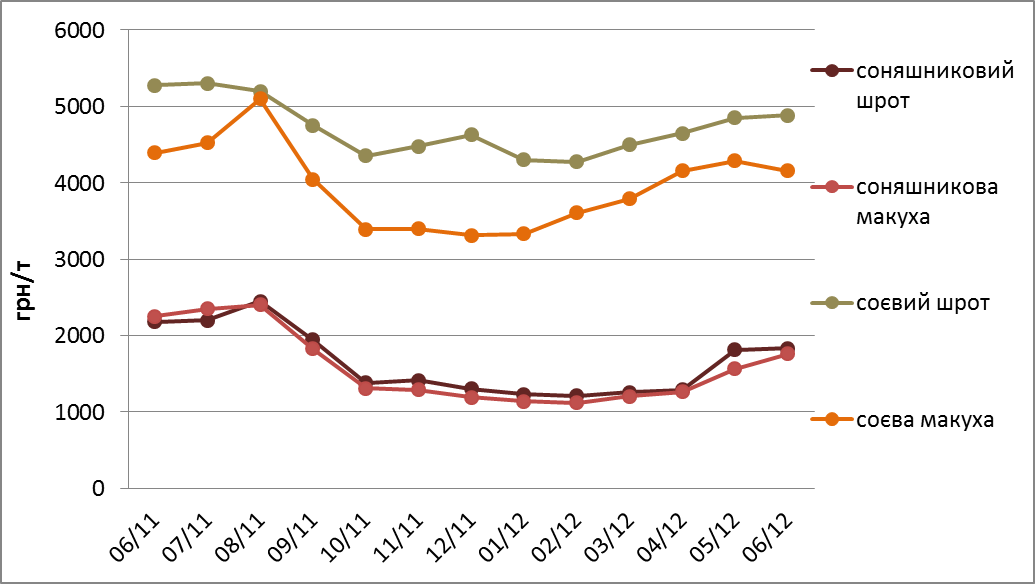 Станом на 3 липня поточного року ціни на шроти соняшниковий та соєвий становили 1820 та 5000 грн/т відповідно. Порівняно із цінами, які було зафіксовано станом на 18 червня соєвий шрот подорожчав на 3,7%. Щодо шроту соняшникового, то ціна на нього майже не змінилась (1820 грн/т). Соєва та соняшникова макухи коштували 4086 та 1642 грн/т відповідно.