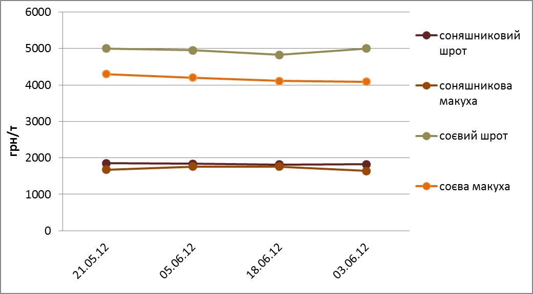 Рис. 1. Динаміка цін на концентровані корми, червень – червень 2011-2012 рр. (за власними даними)