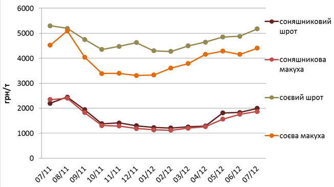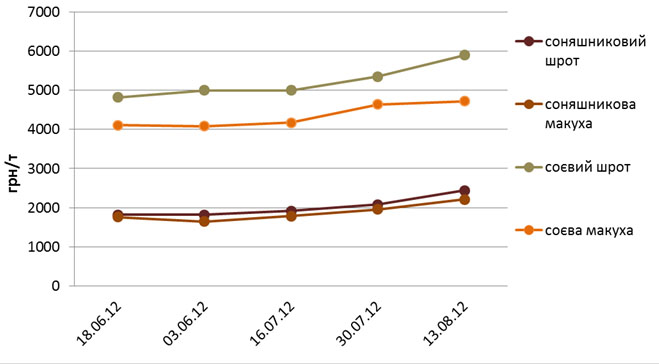За рахунок того, що врожай 2011/12 маркетингового року видався рекордним, ціни на концентровані корми хоч і перебувають на доволі високому рівні, але все ж таки є нижчими, ніж минулого року. Зокрема, якщо станом на середину серпня минулого року ціна на соняшниковий шрот та соняшникову макуху становила 2500 та 2400 грн/т відповідно, то станом на 13 серпня поточного року ці корми коштували в середньому 2440 та 2210 грн/т відповідно. Щодо соєвого шроту, то в другій декаді серпня пропозиція на цей товар взагалі була відсутня, а поточна ціна на нього становить 5900 грн/т. Та ж сама ситуація і з соєвою макухою: у серпні минулого року ціна на неї становила 4900 грн/т, а зараз вона становить 4720 грн/т.