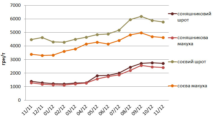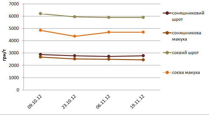 У жовтні-листопаді цього року на внутрішньому ринку спостерігалася стійка тенденція до зниження цін на продукти соєвого комплексу та соняшниковий шрот і макуху. Належність шротів до кормового сектору пригальмовувало процес цінового спаду, як результат тенденції до зростаня цін на зернові.