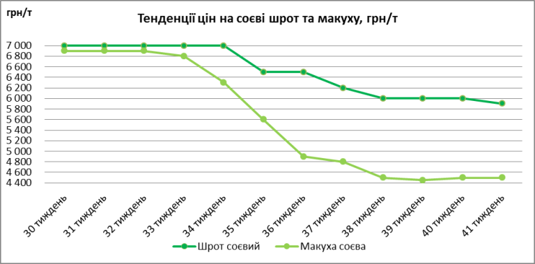 Ціни на соєвий шріт та макуху минулого тижня майже не змінювалися, вони трималися на рівні 5500–5900 грн/т на умовах EXW. Мінімальна ціна впала на 50 грн/т. В сегменті соєвої макухи діапазон цін залишився без змін — 4250–4500 грн/т на умовах EXW.