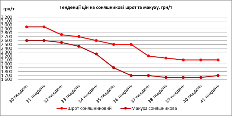 Ціни на соняшникову макуху за тиждень також знизились, особливо мінімальні ― на 150 грн/т. Так, вони коливалися від 1300 до1700 грн/т залежно від якісних показників. Варто зазначити, що в даному сегменті триває сезонне збільшення активності торгово-закупівельної діяльності. Вартість низькопротеїнової макухи — 1300 грн/т.