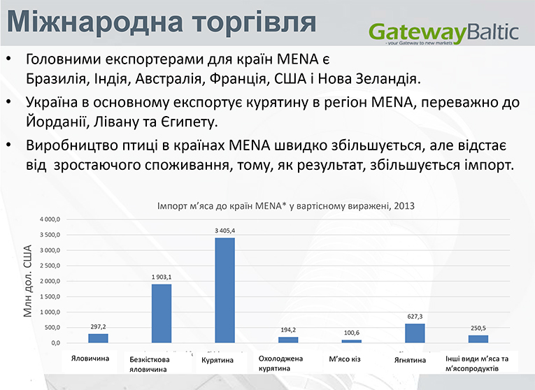 Тікнусс Мартінш, | MENA(Алжир, Бахрейн, Джібуті, Єгипет, Ісламська Республіка, Іран, Ірак, Йорданія, Кувейт, Ліван, Лівія, Марокко, Оман, Катар, Саудівська Аравія, Держава Палестина, Судан, Сирія, Туніс, OAЕ , Ємен). Перспективи Населення регіону сягає близько 365 млн чоловік. Із них 60% ― жителі міст. Спостерігаються постійні тенденції до зростання. Збільшується ВВП на душу населення (у 2016-му прогнозують, що цей показник у регіоні підніметься на 4,1%). Країни MENA чутливі до ціни на нафту оскільки у регіоні зосереджено 60% світових запасів нафти і 45% — природного газу. Тривалі громадянські війни, терористичні атаки і дешева нафта — основні причини повільного зростання економіки цих регіонів. Смакові уподобання Релігія Іслам забороняє споживання свинини. Таким чином, її продаж незаконний у багатьох мусульманських країнах, особливо в тих, де в рамках конституції діють закони шаріату. У країнах з численними немусульманськими меншинами (Єгипет, Бахрейн, Ліван, Дубай в ОАЕ), свинина доступна в міжнародних готелях і в деяких супермаркетах. Яловичини і курятини споживають найбільше. Основні постачальники Особливості співпраці Для експорту м’яса та м’ясопродуктів до країн MENA обов’язково потрібно отримати сертифікат Halal та відповідати його вимогам. Продукти не повинні включати в себе заборонені інгредієнти («харам»). Зокрема йдеться про: мертвечині, кров, свинину, тварин, умертвлених удушенням або вбитих іншими тваринами, вбитих у результаті високої напруги, удару або падіння, хижих тварин (вовки, леви, тигри та ін.), хижих птахів (сокіл, яструб, орел та ін.), м’ясо собак, віслюків і мулів. Щоб ввозити українські м’ясні продукти, експортерам варто: