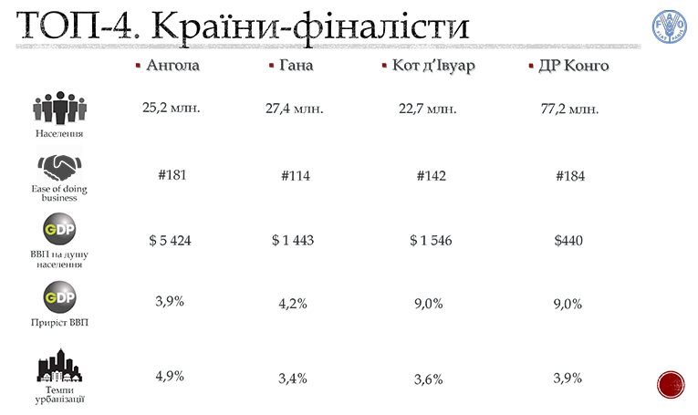 Гонтар Володимир, | Субсахарська АфрикаДля оцінки експортного потенціалу в регіон Субсахарської Африки експерти ФАО досліджували всі країни регіону (50 країн, за виключенням Британської території в Індійському океані) за 19 показниками. За результатами дослідження, країни, які набрали найбільшу сумарну кількість показників були відібрані для подальшого деталізованого розгляду. Серед них: В деяких із цих країн понад половина населення живе не менше, ніж на 4 долари в день, що для даного ринку підкреслює наявність середнього класу та платоспроможність попиту. Проте середній клас в країнах стрімко розвивається. Крім населення швидко урбанізується. Окрім обраних ТОП-4 країн дослідження, потенційно цікавими для експорту молочної продукції українського виробництва можуть бути також Бенін, Намібія та Конго. При виборі стратегії розвитку продажів в регіоні Субсахарська Африка експерти радять обирати відразу декілька країн для подальшого опрацювання. Оскільки диверсифікація ризиків для українських виробників ― запорука забезпечення фінансового здоров’я компаній. Більшість країн цього регіону, не дивлячись на високі темпи економічного зростання, економічно, фінансово чи політично не стабільні. |