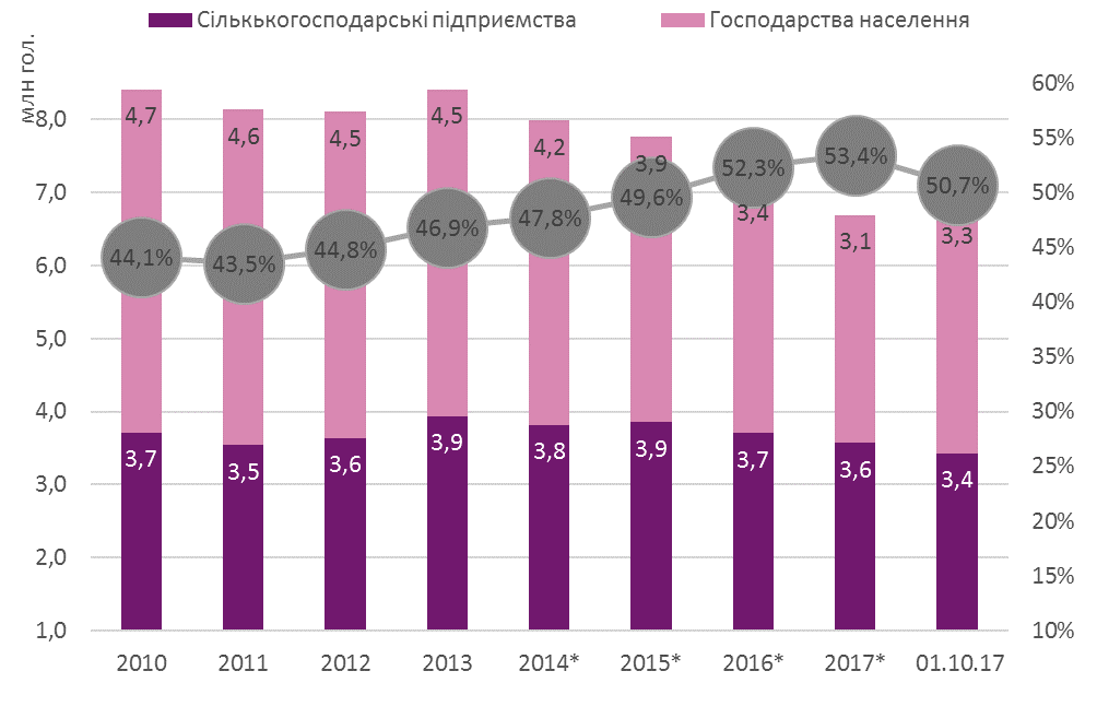 Бондарська Олександра, | Коливання чисельності поголів’я — частина нормального циклічного розвитку галузі: після важких періодів спостерігаємо скорочення, після кращих — відновлення. Так, після складних часів у першому кварталі 2016-го галузь пройшла своєрідний «природний відбір» — погіршення економічної ситуації в країні (падіння споживчої активності, російське ембарго на українську продукцію свинарства тощо). Відповідно, частина операторів залишили ринок, а ті, хто втрималися «на плаву» вже у 2017-му відчули покращення, зокрема ріст цін. Якраз сприятлива ринкова ситуація переконує вітчизняних виробників свинини у привабливості діяльності і спонукає до розширення виробничих потужностей. Значний відсоток операторів почали реконструкцію/модернізацію свинокомплексів, вирішили оновити маточне поголів’я тощо. Це підтверджує опитування Асоціації «Свинарі України», до якого долучилися 300 господарств (понад 60% промислового маточного поголів’я). Половина респондентів підтвердила бажання розвивати свинарський бізнес за рахунок нарощування поголів’я чи спорудження нових/модернізації/реконструкції існуючих виробничих майданчиків. Окремі оператори розглядають перспективи вертикальної інтеграції з м’ясопереробкою. Відповідно є всі передумови для відновлення чисельності поголів’я і маточного, і загального. Звісно, результатів не варто чекати «за помахом чарівної палички», їх спостерігатимемо на початку наступного року. Ще деякий час внутрішній ринок відчуватиме наслідки скорочення свинопоголів’я: менша пропозиція свинини слугуватиме підтримкою для закупівельних цін допоки її обсяги не будуть урівноважені з попитом та не перевищать його. Не варто і забувати про ще один вагомий фактор, який тисне на галузь — поширення африканської чуми свиней. Цьогоріч маємо вже 127 випадків (станом на 22.10), це абсолютний антирекорд, порівняно з попередніми роками, коли кількість випадків не перевалювала за сотню. З іншого боку, АЧС діє як «сито»: професійні господарства, які дбають про біобезпеку, продовжують працювати, а дрібні «аматори» — виходять з бізнесу через нехтування правилами і неготовність інвестувати в протиепізоотичні заходи. Динаміка поголів’я свиней у розрізі категорій господарств станом на початок року, 2010-2017 Джерело: аналітичний відділ АСУ за даними ДССУ *без урахування АР Крим Динаміка поголів’я свиней у розрізі категорій господарств станом на початок року, 2010-2017 Джерело: аналітичний відділ АСУ за даними ДССУ |