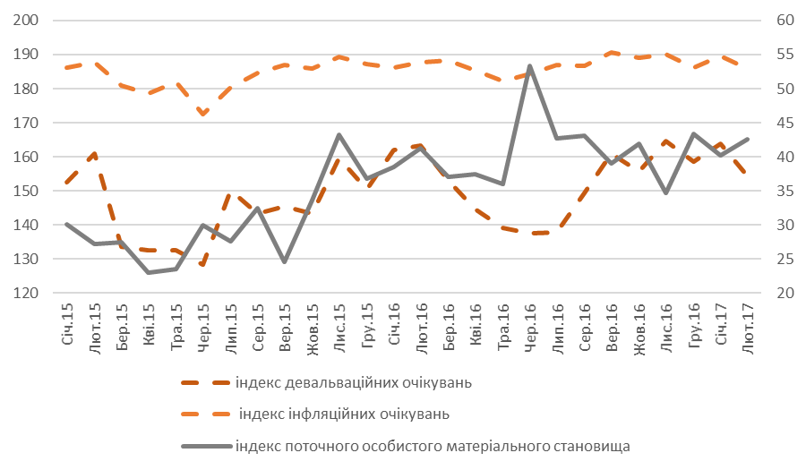 Як наголошують експерти, споживчі оцінки особистого матеріального становища у лютому виявилися кращими ніж на початку 2017-го. Хоча цей показник «програвав» максимальним значенням попереднього року, який спостерігався у червні 2016-го. Так, в останній місяць зими відповідний показник додав 2,4 пункти та закріпився на позначці, що на 1,4 пункти вища ніж у аналогічний період минулого року.