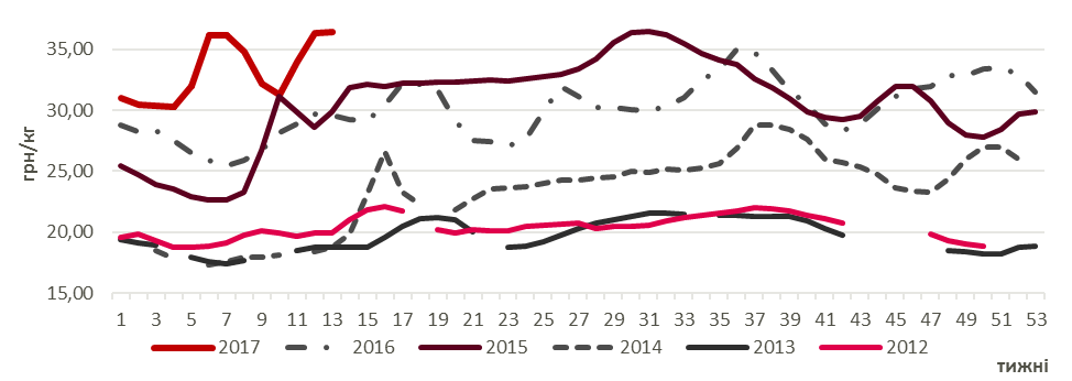 Динаміка закупівельних цін на живець свиней І-ї категорії (2012-2017 рр.)