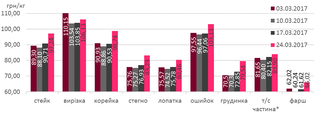 Наприкінці четвертого тижня березня роздрібні ціни «наздогнали» здороження сировини. Так, порівняно з цінами позаминулого тижня, попередньої п’ятниці свинячі частини у мережах супермаркетів додали від 2% до понад 9%. Зокрема, свинячі стейк, стегно, ошийок та грудинка подорожчали більш ніж на 6 грн/кг. Свинячий фарш та лопатка піднялися в ціні на 4,4 та 4,68 грн/кг, відповідно. Ціна корейки наблизилася в притул до позначки 100 грн/кг, піднявшись на 8,2 грн. Вирізка, яка перетнула згадану межу минулого тижня додала ще 2,3 грн/кг та коштує 106,1 грн/кг в середньому. Найменше здороження зазнала тазостегнова частина, кілограм якої у середньому в роздрібних мережах коштує 83,9 грн/кг.