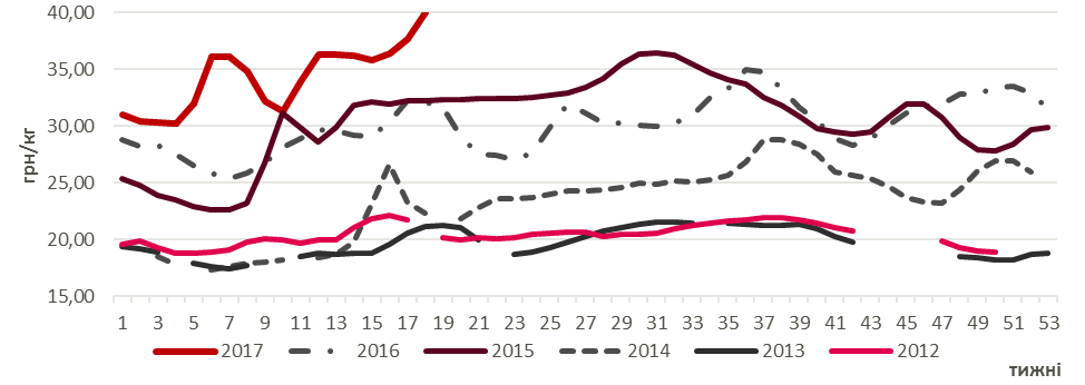 Динаміка закупівельних цін на живець свиней І-ї категорії (2012-2017 рр.)