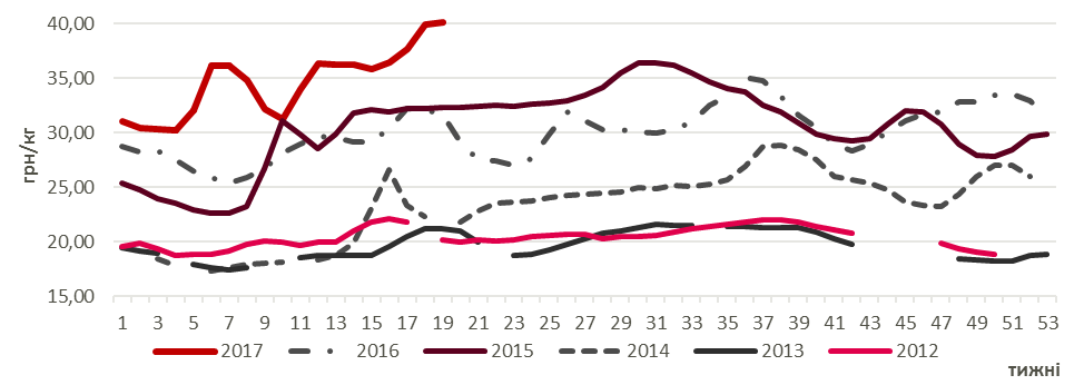 Динаміка закупівельних цін на живець свиней І-ї категорії (2012-2017 рр.)