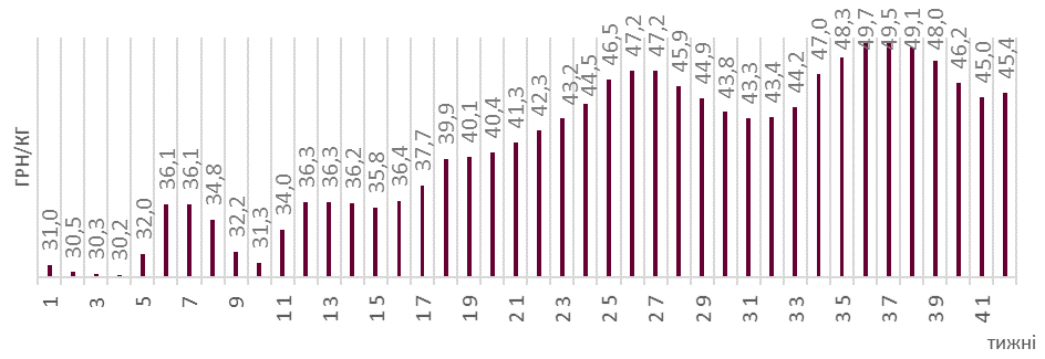 За відгуками представників м’ясопереробної галузі послаблення цін на свинину як в закупівлі (-9% у порівнянні з максимальною на 36-му тижні), так і в роздрібній торгівлі (-3%, відповідно) не мало позитивного впливу на реалізацію свинини та продуктів з неї. Деякі з них відзначають суттєве погіршення продажів у жовтні, порівняно з попереднім місяцем. При цьому, окремі переробники відзначають початок сезонного пожвавлення пропозиції живця, яка на тлі сезонно меншої споживчої активності стимулює послаблення цін закупівлі.