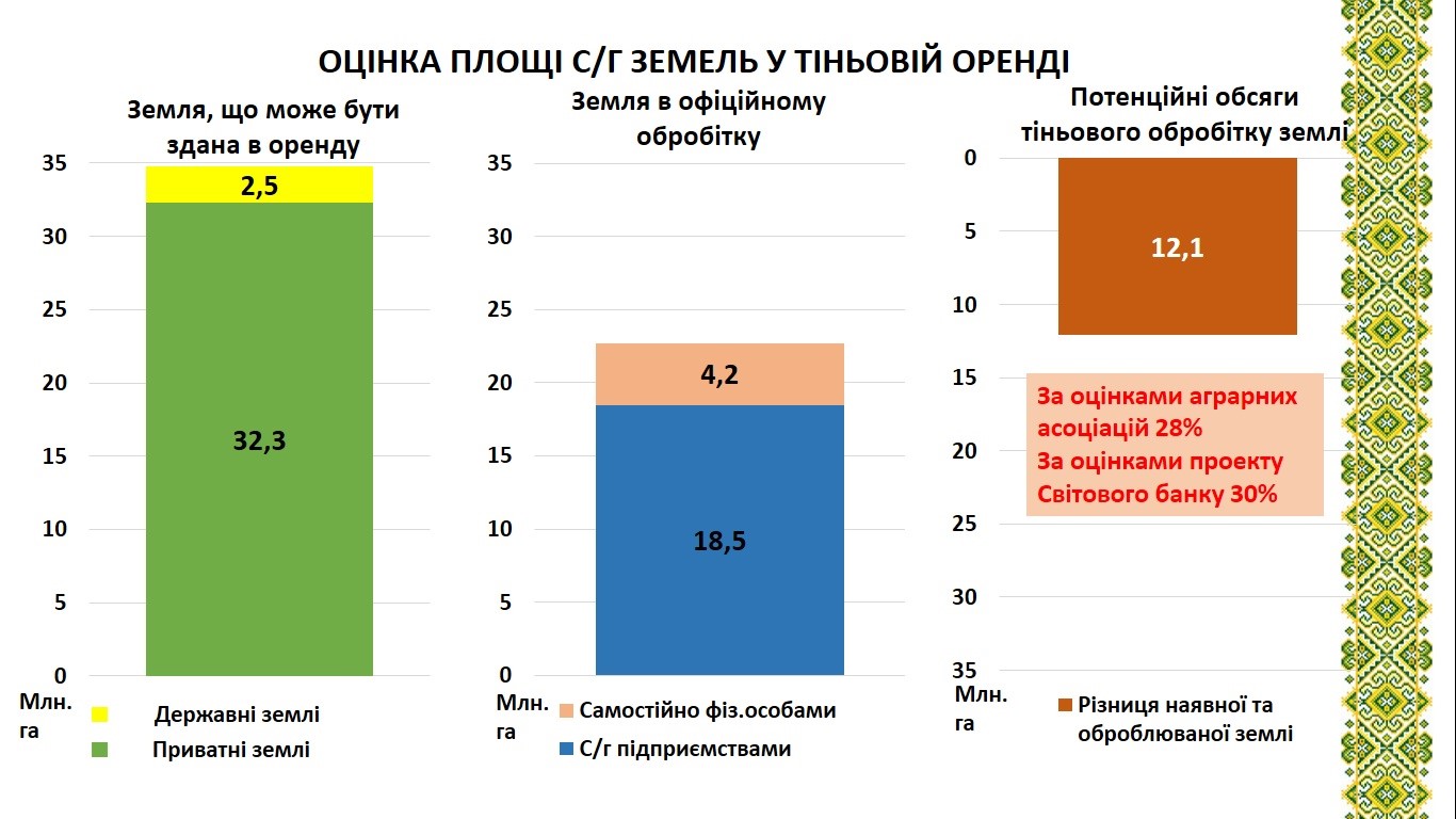 Так, загальна площа земель, які можуть бути здані в оренду складає майже 35 млн га. У той же час в офіційному обробітку, згідно максимально можливої оцінки знаходяться не більше 23 млн га. Таким чином, потенційний обсяг земель, які знаходяться в тіньовій оренді складає біля 12 млн га або 28% від загальної площі сільськогосподарських земель.