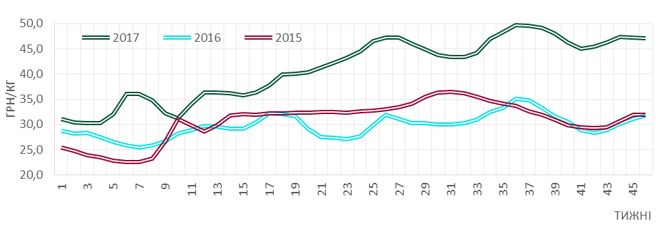 Динаміка закупівельних цін на живець свиней І-ї категорії потижнево, 2017