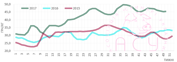 Динаміка закупівельних цін на живець свиней І-ї категорії потижнево, 2017