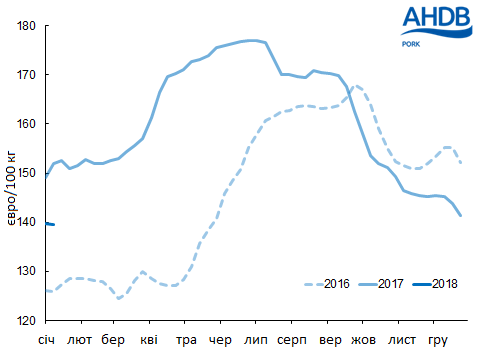 Так, свинина в ЄС дешевшала впродовж 4-х останніх тижнів року. 2017-й закінчився з ціною 139,67 євро/100 кг (-5,76 євро/100 кг за вказаний період).