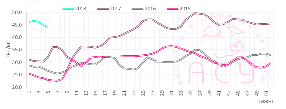 Динаміка закупівельних цін на живець свиней І-ї категорії потижнево, 2015-2018 рр.